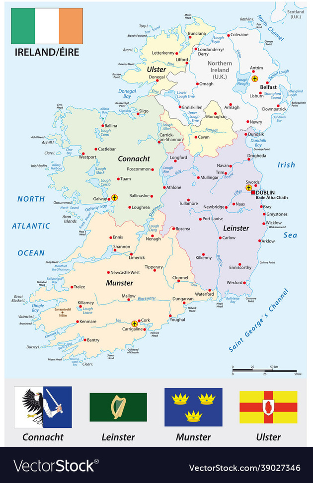 The Republic of Ireland is completely separate from the UK and has four main provinces: